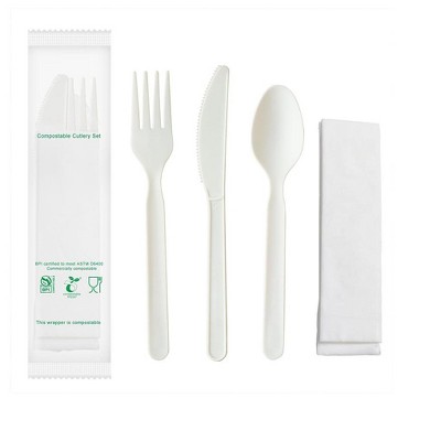 Aoibox Heavy-duty Compostable Cutlery Kits, BPI Certified, 200 Sets (Fork, Spoon, Knife, Napkin) Individually Wrapped, Plant-Based CPLA