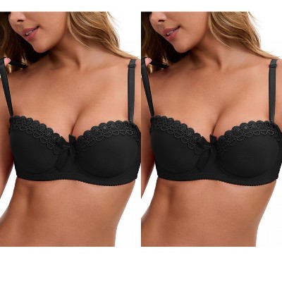 INSPIRE CHIC Women's Deep V Strapless Wireless Demi Bandeau Lace Thin on Top Thick on Bottom Push-Up Tube Bra 2 Packs