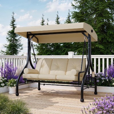 GustoWave 3-Person Patio Swing Chair with Adjustable Canopy, Cup Holders and Reclining Seat Bed- Khaki