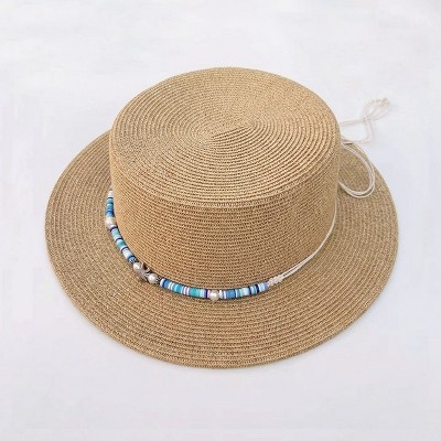 Anna-Kaci Women Straw Boater Hat Wide Brim Summer Sun Hat with Beaded Band Lightweight, Natural Blue Bead