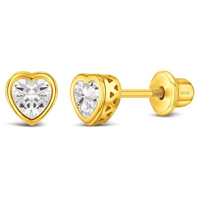 Girl's Heart CZ Bezel Screw Back Gold Plated Sterling Silver Earrings - In Season Jewelry