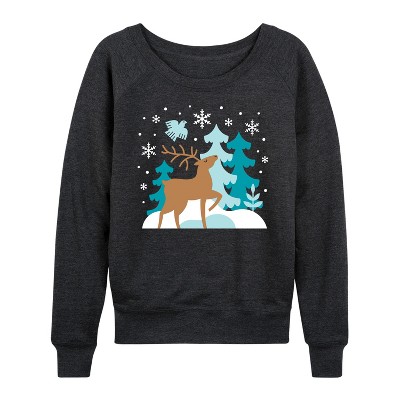 Women's - Instant Message - Scandinavian Winter Deer Lightweight French Terry Wide Neck Long Sleeve Graphic Shirt