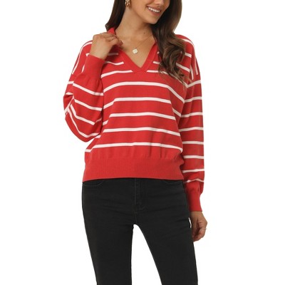 Seta T Women's Fall Casual Striped Long Sleeve Polo V Neck Pullover Drop Shoulder Knitted Sweater Tops