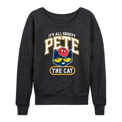 Women's - Pete the Cat - It's All Groovy Collegiate Lightweight French Terry Wide Neck Long Sleeve Graphic Shirt