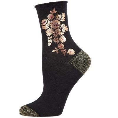Memoi Gilded Roses Metallic Floral Cotton Blend Crew Socks Black 9-11