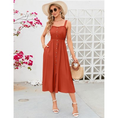 Womens Summer Dress Strap A-Line Drees High Waist Sundress Front Button Ruffle Trim Detail