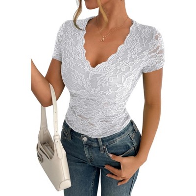 Women's Floral Lace V-Neck Short Sleeve Top Summer Casual Slim Fit Shirt Scalloped Sheer Layering Blouse