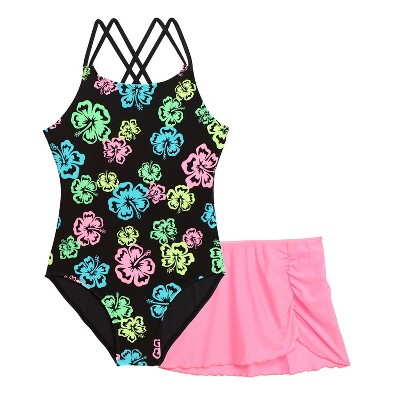 Aqua Green Girls X-Back One Piece Swimsuit with Mesh Sarong Coverup Skirt 2-Piece Set