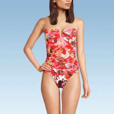 Lands' End Women's D-Cup SlenderSuit U-Wire Bandeau Tankini Top - 10 - Daylily Red Multi Floral