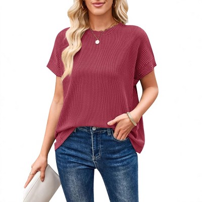 Women's Round Neck Short Sleeve Ribbed T-Shirt Opaque Casual Everyday Top Versatile Durable Premium Tee