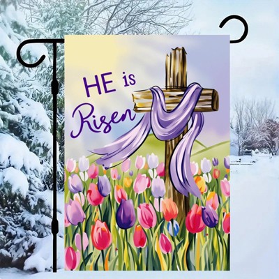 Easter Garden Flag Burlap, Small Vertical Sun Cross Tulip Yard He is Risen for Religion Spring Outdoor Outside Decoration 12x18in