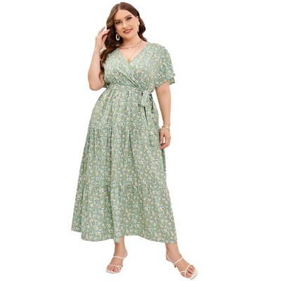 BLUEMING Plus Size Womens Dresses Floral Surplice A-Line Maxi Dress Waist Belted Floral Maxi Dress Wasit Tie Bell Sleeve Dress
