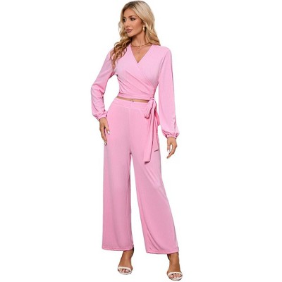 2 Piece Outfits for Women Fall Sets Long Sleeve Sexy V Neck Wrap Tie Knot Crop Tops Wide Leg Pants Sets