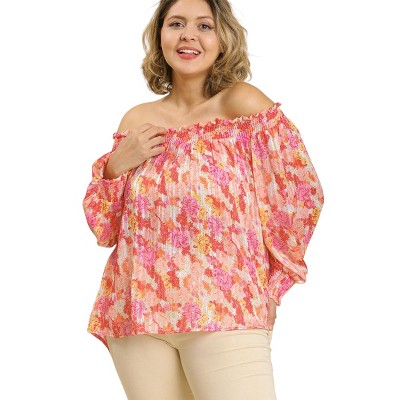 Slickblue Women's Sheer Off Shoulder Floral Blouse, High Low Hem Top with Metallic Detail, Green Mix/Pink Mix, XL-2XL