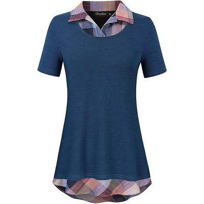 Allegra K Women's Tie Neck Peter Pan Collar Short Sleeve Plaid Shirt