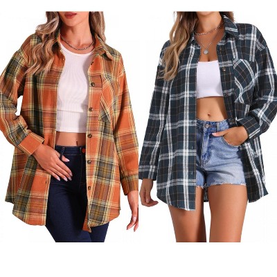 Coolmee Women's Plaid Shirts Long Sleeve Turn-Down Collar Button Down Tops Ruched Waisted Pleated Blouses with Pockets S Orange