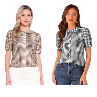 INSPIRE CHIC Women's Plaid Gingham Puff Short Sleeve Peter Pan Collar Button Down Shirt 2 Packs