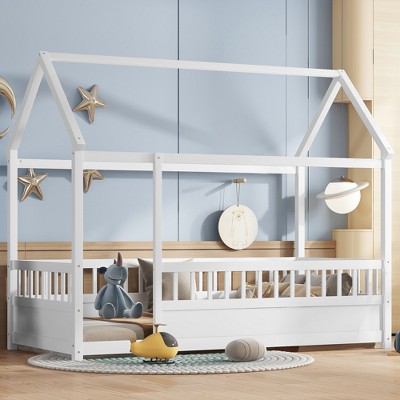 MAYEERTY White Full Kids House Bed Frame with Storage Drawers, Montessori Tent Bed with Rails Roof