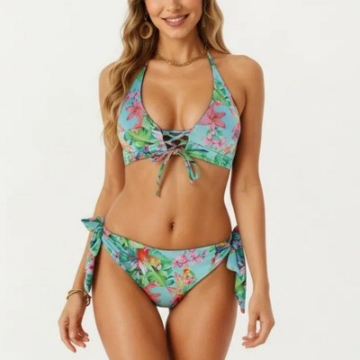 Anna-Kaci Swim Women's 2-Piece Bikini Set with Lace Up Front Tie Top Halter Neck Side Tie Bottom Adjustable Fit