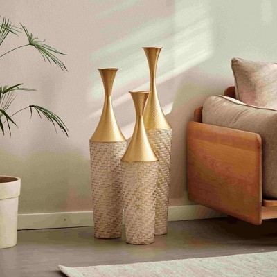 Angel Sar 3 Piece Woven Pattern Metal Vase Set, Tall White Cylinder Floor Vases with Gold Weave Design, 35.4" 31.5" 27.5" H Home Decor