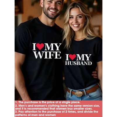 Fioneca Couple Matching T-Shirts - I Love My Wife & Husband Large Print, Unisex Round Neck Short Sleeve T-Shirts, Suitable for Anniversary Gifts