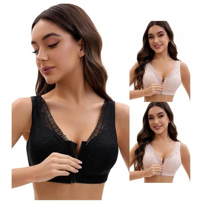 INSPIRE CHIC Front Closure for Women's Lace Full Coverage V Neck Wirefree Adjustable Straps Bras 3 Packs