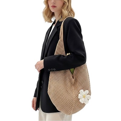 Alilang Woven Crochet Hobo Shoulder Bag Lightweight Knit Slouchy Tote with Flower Detail