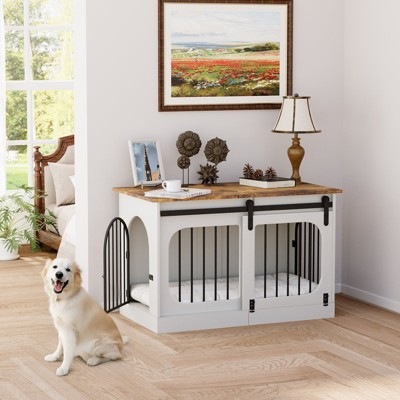 37" Dog Crate, Farmhouse Dog Crate Furniture with Sliding Barn Door, Flip Top Wooden Dog Kennel End Table with Wheels and Movable Divider