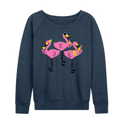Women's - Instant Message - Three Flamingos Drinking Lightweight French Terry Wide Neck Long Sleeve Graphic Shirt