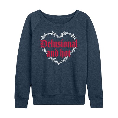 Women's - Instant Message - Delusional & Hot Lightweight French Terry Wide Neck Long Sleeve Graphic Shirt