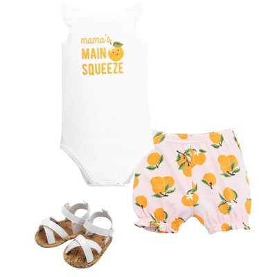 Hudson Baby Girl Cotton Bodysuit, Shorts and Shoe Set, Main Squeeze Orange