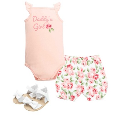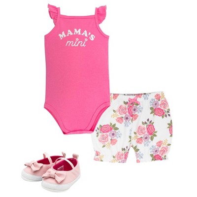 Hudson Baby Girl Cotton Bodysuit, Shorts and Shoe Set, Mama Floral