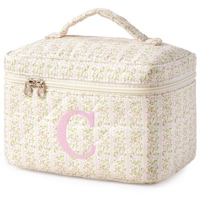 Narwey Initial Quilted Makeup Bag, Pink Cosmetic Travel Toiletry Bag, Flowers Coquette Zipper Make Up Pouch Organizer Teen Girl Gift Trendy Stuff C