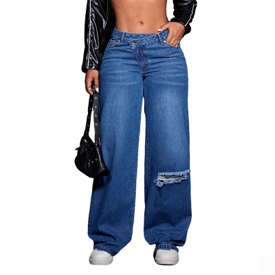 Women's Dark Blue Skinny Ripped Denim Jeans Stretchy Feet Long Tear Legging Pencil Pants Casual Waist