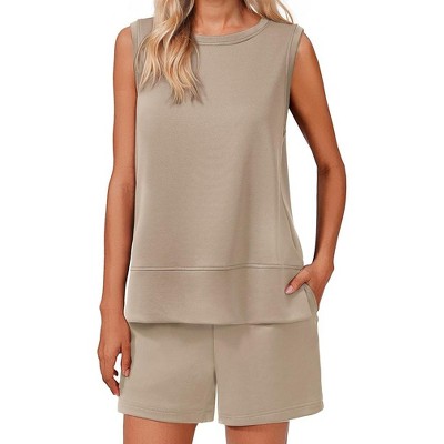 Pinspark Two Piece Sets for Women Summer Lounge Set Casual Sleeveless Crewneck Tops and Drawstring Short Outfits Tracksuit Side Slits