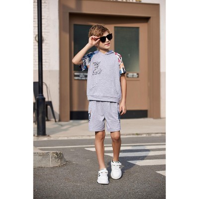 Arshiner Boys 2 Piece Summer Outfits Letter Graphic Colorblock Short Sleeve Hoodie and Short Sets whith Pockets 5-12 Years