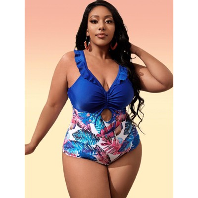 Clearlove Womens Plus Size Swimsuits One Piece Bathing Suits Botanical Color Block Ruffle Front Drawstring Ruched Bust V Neck Swimsuits