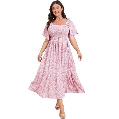 Women's Plus Size Maxi Dress Square Neck Short Sleeve Smocked Flowy Boho Floral Print Casual Summer Wedding Party Dresses