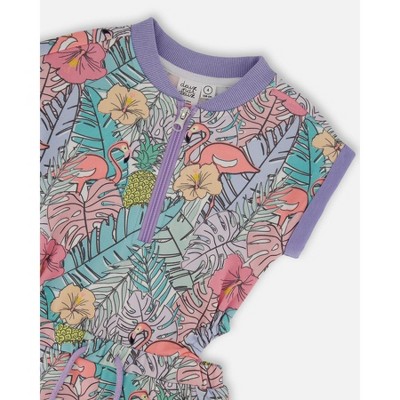 Deux par Deux Girl Printed French Terry Romper Lilac Tropical and Pink Flamingos