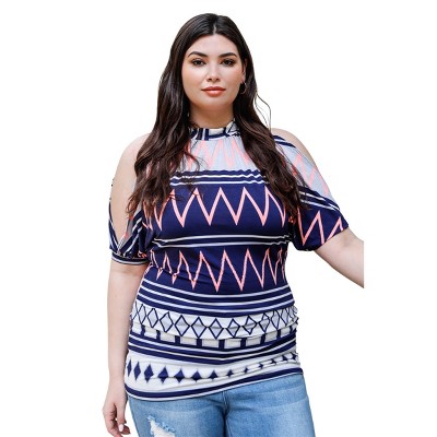 Slickblue Plus Geometric Cold Shoulder Blouse, Halter Neck with Self-Tie Back, Short Sleeve, Navy Multi or Navy Mint, 1XL-3XL