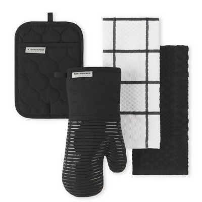 KITCHENAID Quilted Cotton Terry Cloth Oven Mitt, Pot Holder, Kitchen Towel 4-Pack Set, Silicone Grip, Matte Black, 16"x26", 7"x13" & 7"x10"