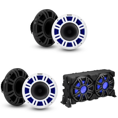 Kicker Pontoon - Tritoon Boat Premium Audio Upgrade, (4) 6.5" LED Marine Speakers, 10" Subwoofer tube & KXMA 5Ch. Marine Amplifier Bundle