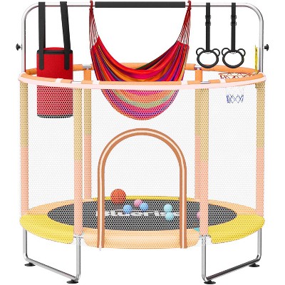 55" Kids Indoor Trampoline with Adjustable Gym Bar,4-in-1 Fun Toys, Silent Suction Cup Legs,Safety Enclosure Net & Padded Frame, Sturdy Indoor Jumper