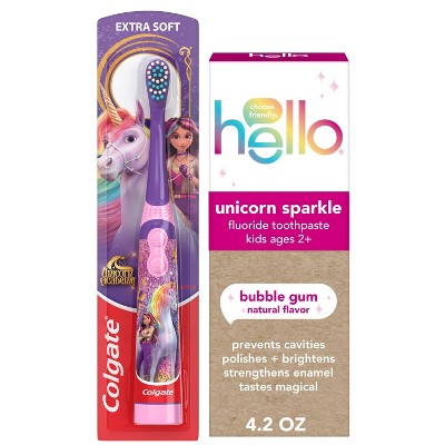 hello Kids'4.2oz Unicorn Sparkle Bubble Gum Fluoride Toothpaste + Colgate Kids' Battery Powered Unicorn Academy Toothbrush