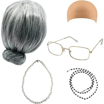 4E's Novelty Old Lady Costume for Kids - 5 Pc Set: Gray Wig, Glasses with Chain, Wig Cap, Necklace - 100th Day of School, Fits Ages 3-10