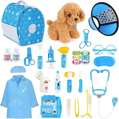 Etokfoks 25pcs Kids Doctor Playset with Plush Dog Vet Costume Stethoscope Light Sound Accessories Large Dog Cage Bag 22x14x20cm Role Play Kit