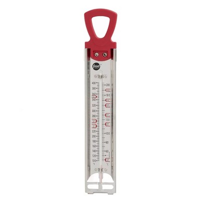 Food Network Candy Thermometer – Clip-On Stainless Steel Design with Stay-Cool Handle, 100°F–400°F Gauge for Candy, Oil & Deep Frying, Red