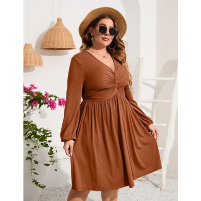 Coolmee Women's Plus Size Dress V Neck Long Sleeve Front Knotted Elastic Elegant Dress A Line Knee Length Midi Dress