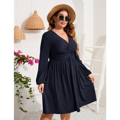 YesFashion Women's Plus Size Dress Long Sleeve V Neck Front Knotted Elastic Elegant Dress Knee Length Midi Dress