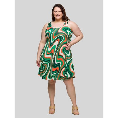 24seven Comfort Apparel Plus Size Green Print Sleeveless Knee Length Tank Swing Dress